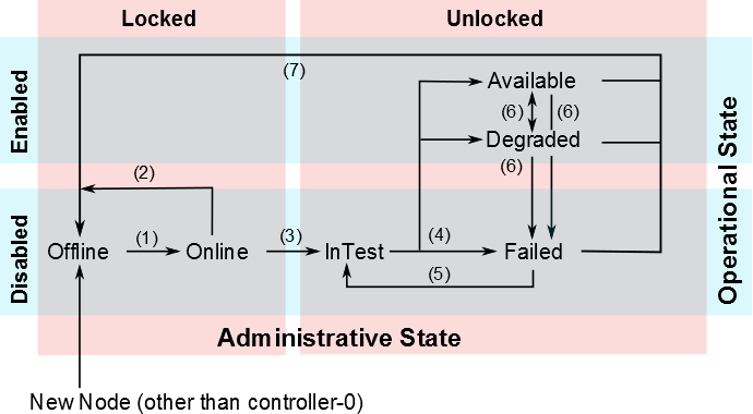 As shown in the diagram above, there are two possible administrative states for a host (Locked and Unlocked) and two operational states (Disabled and Enabled). Within this functional matrix, the host can be in several availability states. All of these states are reported in the host inventory (see Hosts Tab.)