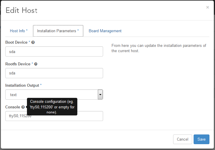 The installation parameters are part of the system inventory host details for each node, and can be specified when the host is added or updated. These parameters can be set as part of a host-add or host-bulk-add, host-update, or via the GUI when editing a host.