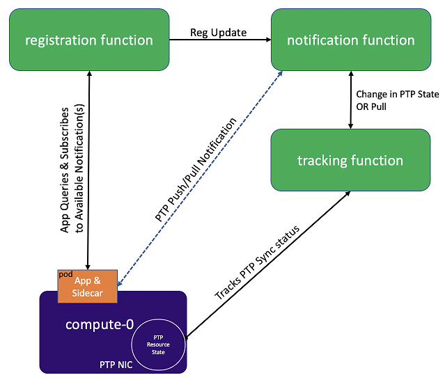 Once an application subscribes to PTP notifications it receives the initial data that shows the service state, and receives notifications when there is a state change to the sync status and/or per request for notification (pull).