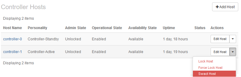 Swact is an abbreviated form of the term Switch Active (host). When selected, this option forces the other controller to become the active one in the HA cluster. This means that all active system services on this controller move to standby operation, and that the corresponding services on the other controller become active.