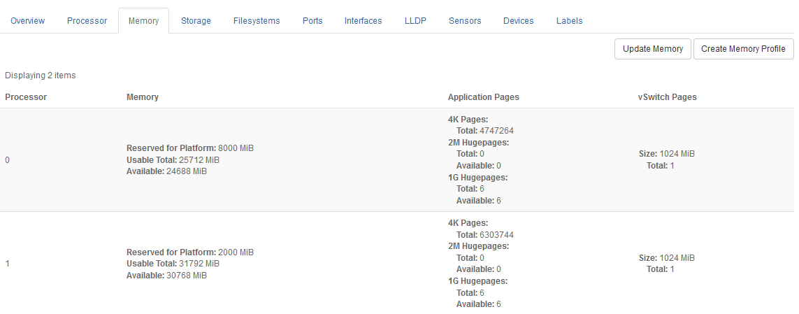 For a worker node, as in the example above, it displays the amount of memory reserved for the platform (system software), and the usable total available for use by applications. The usable total includes memory reserved for vSwitch huge pages.
